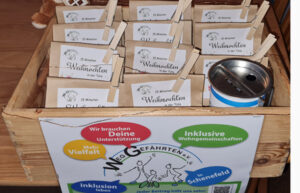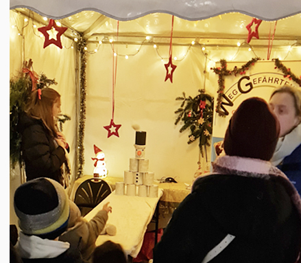 Auf dem Weihnachtsmarkt selbst wurde unser festlich geschmücktes Weihnachtszelt mit der Scheeballschlacht (Dosenwerfen) schnell zu einem beliebten Anziehungspunkt für alle großen und kleinen Weihnachtsmarkt-Besucher*innen. Dabei ergaben sich viele schöne Gespräche, und das große Interesse an unserem inklusiven Wohnprojekt hat uns sehr gefreut.
